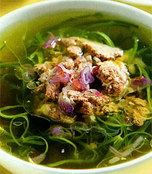 Múc canh vào tô, thêm tiêu xay, ngò ôm, ngò gai và ớt sừng vào tô. Dùng nóng.